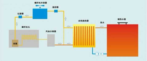 熱能回收裝置工作原理:空壓機(jī)的高溫油經(jīng)過熱交換器把熱量傳遞到冷卻水中,冷卻水被加熱后流到保溫貯水桶中,這樣就可達(dá)到熱能回收的目的。